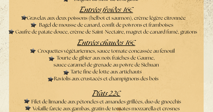 Pour célébrer les fêtes en toute gourmandise, nous vous proposons un menu festif et raffiné, conçu pour éveiller vos papilles et réchauffer vos coeurs !